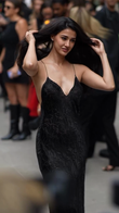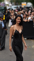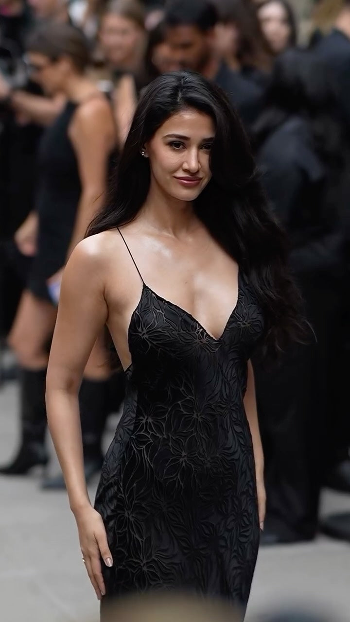 This black slip dress features a low-cut design that perfectly showcases the neck and collarbone, adding a touch of allure. The delicate floral pattern adds detail and dimension to the overall look.
