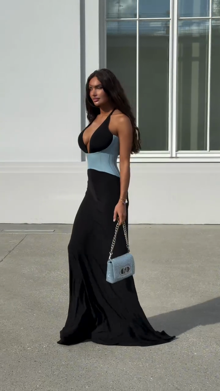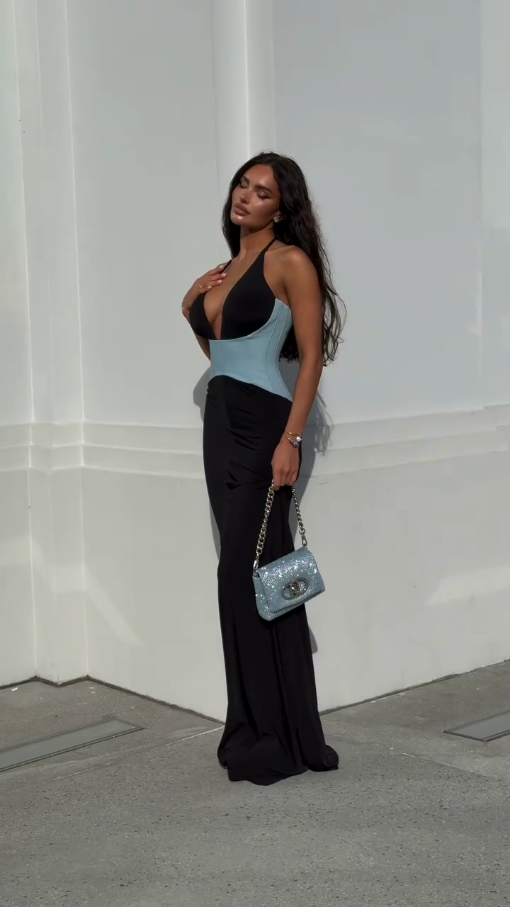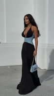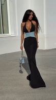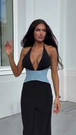 Black Halter Neck Maxi Dress with Blue Corset Detail