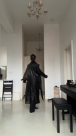 The person is wearing a black leather trench coat, which has a sleek and shiny appearance. Underneath the coat, there's a dark - colored top, possibly a turtleneck. The coat features a wide collar and a buckle detail around the waist area. The individual is also seen holding a dark - colored handbag.