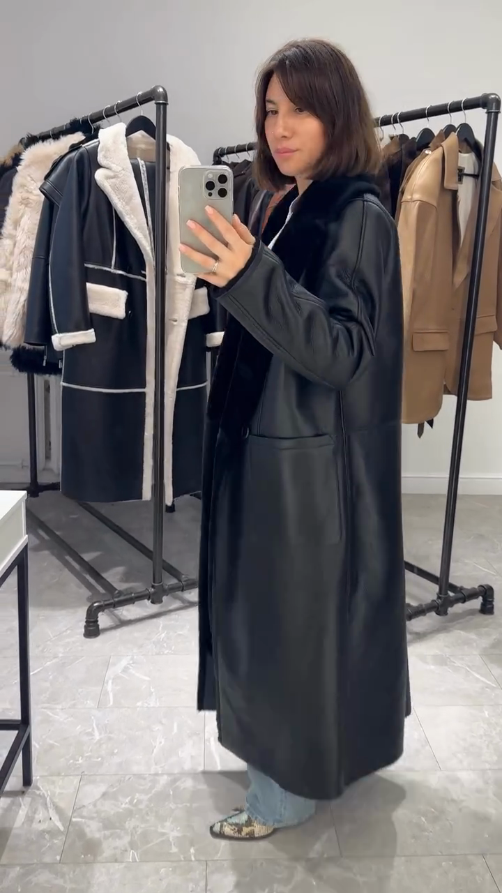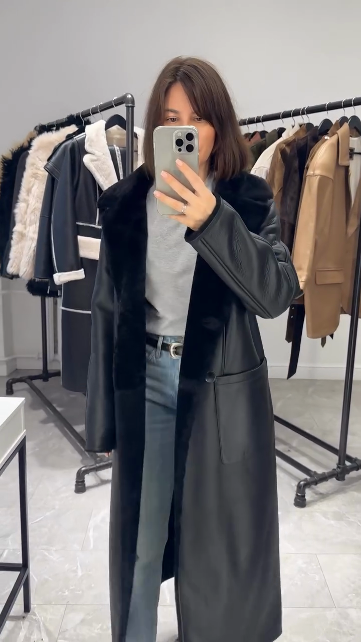 Elevate your winter wardrobe with this Black Shearling - Collar Leather Trench Coat. The plush shearling collar adds warmth and luxury, while the sleek leather design ensures timeless style. Perfect for cold days or stylish layering. Lightweight structure supports fast page load. Shop now for a chic, cozy essential!