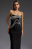 Make a glamorous entrance in this Black Strapless Midi Dress. Adorned with eye - catching silver rhinestone swirls, it hugs your curves for a sleek, elegant look. Perfect for cocktail parties or formal events. Lightweight fabric ensures fast page load. Shop now for a show - stopping outfit!