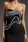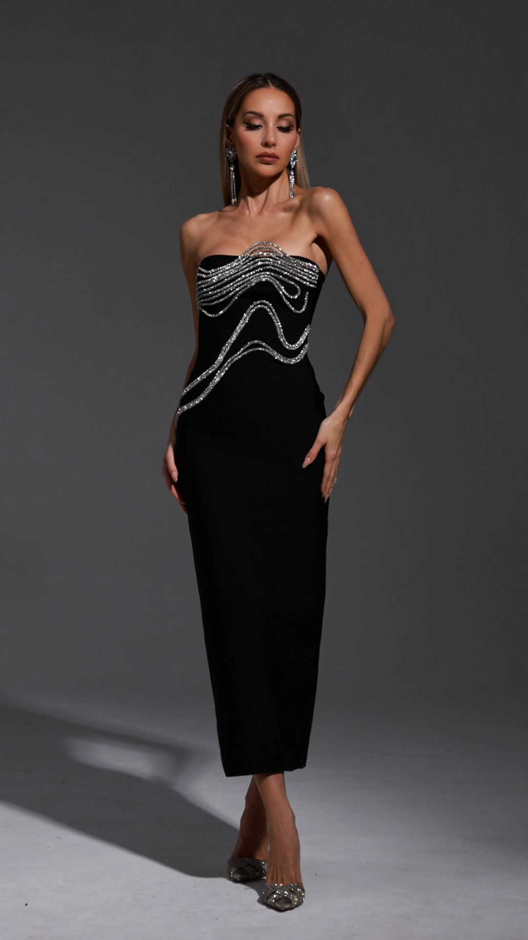 Black Strapless Midi Dress with Silver Rhinestone Details