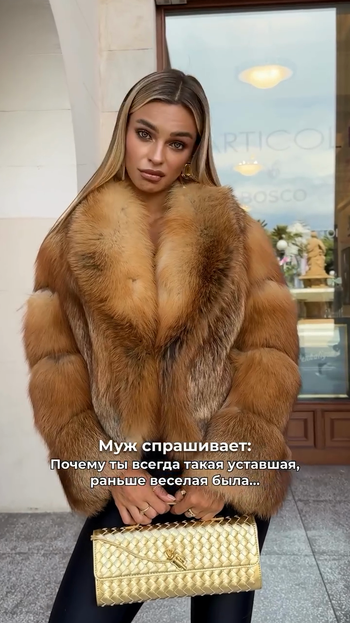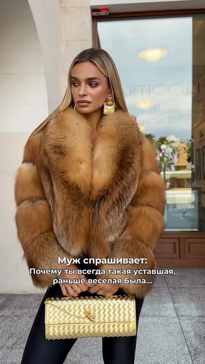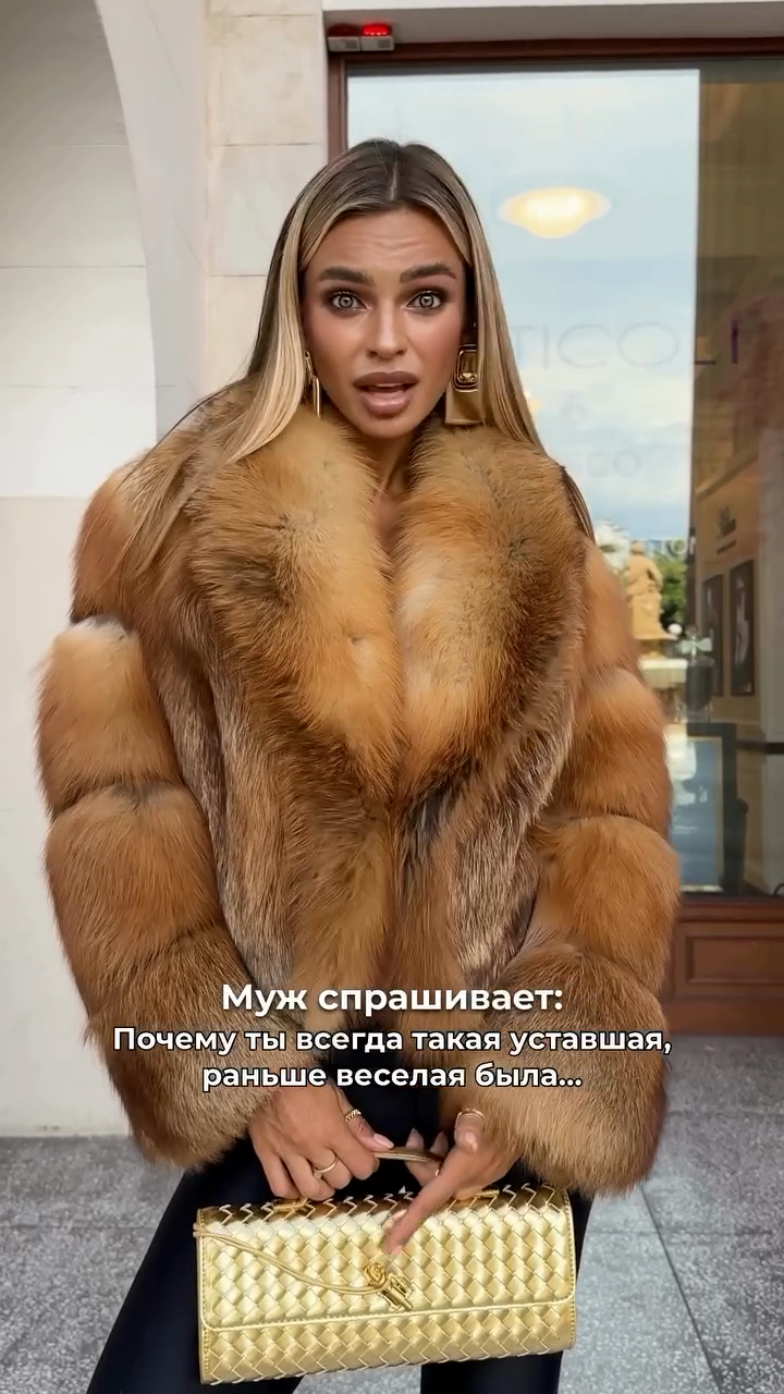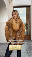 This brown fur coat features a luxurious, thick texture and a wide, plush collar that exudes elegance and warmth. The woman wearing it accessorizes with large gold hoop earrings and holds a gold - toned, intricately woven clutch bag. The outfit, paired with black pants, is suitable for upscale events or cold - weather outings where a statement of sophistication is desired.