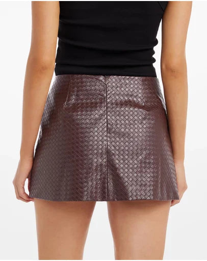 Brown Woven Faux Leather Jacket and Mini Skirt Set