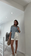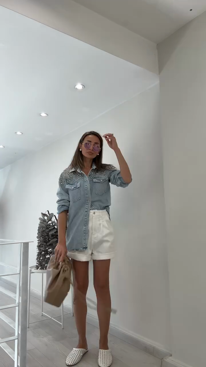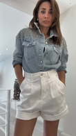 Denim Shirt Jacket with Rhinestone-Embellished Shoulders