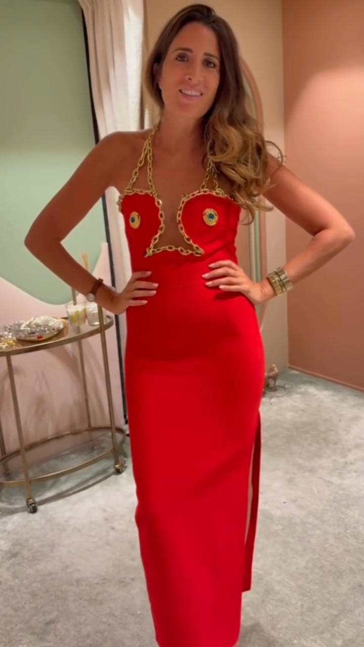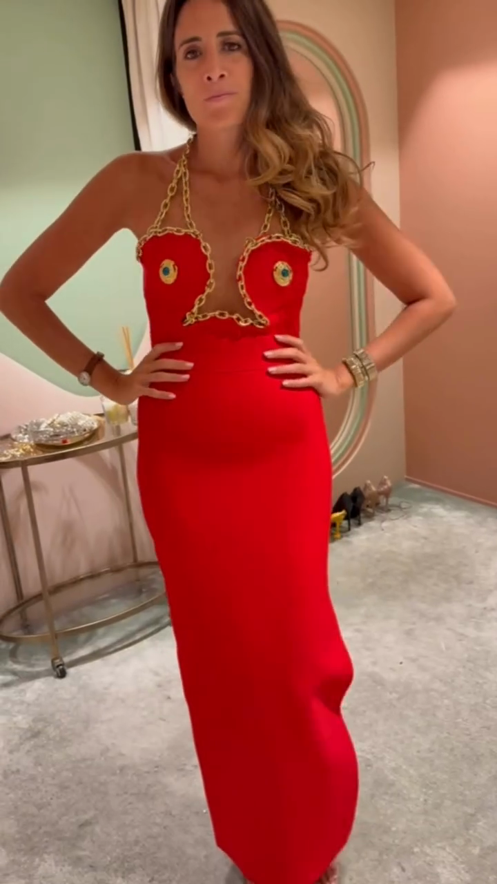 This red maxi dress stands out with its bold halter neckline and gold chain embellishments. The chain accentuates the bust, while the jewel-like decorative buttons add a touch of luxury and edge. The slim fit hugs the body, while the high slit adds a touch of allure. It's perfect for making a statement at evening parties, parties, or formal gatherings. Made from high-quality fabric, it drapes beautifully and is comfortable, allowing for freedom of movement and a glamorous look.