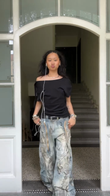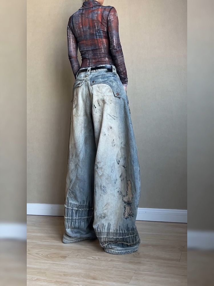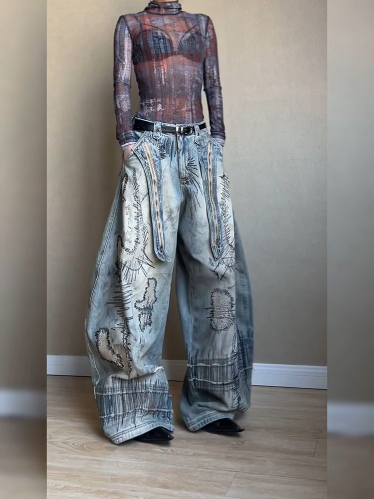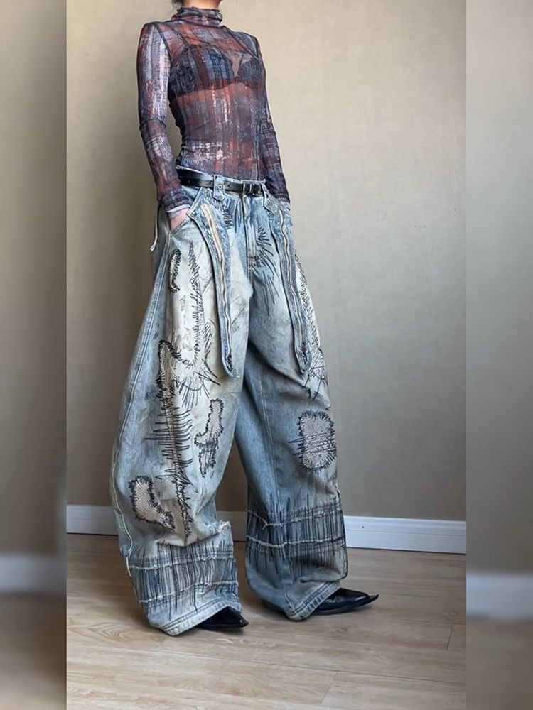 Embroidered Wide - Leg Denim Trousers