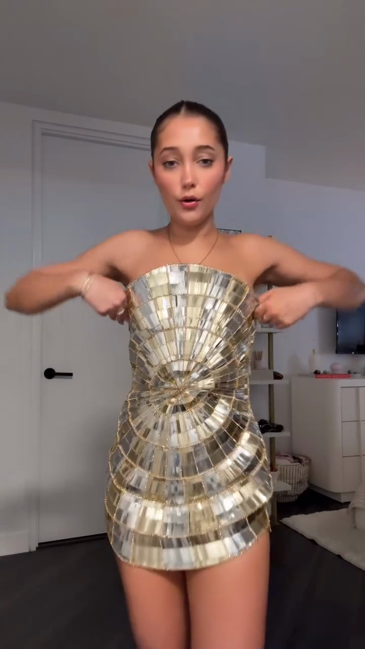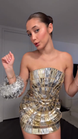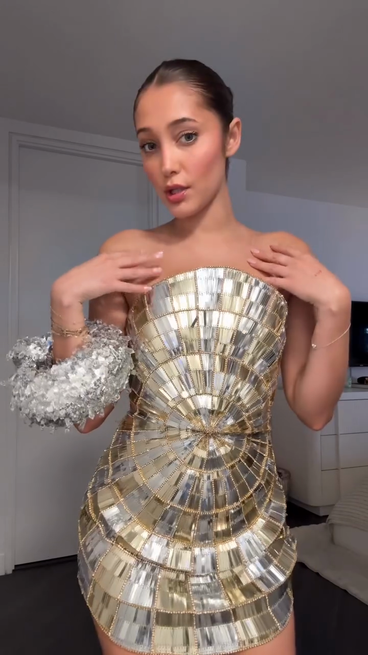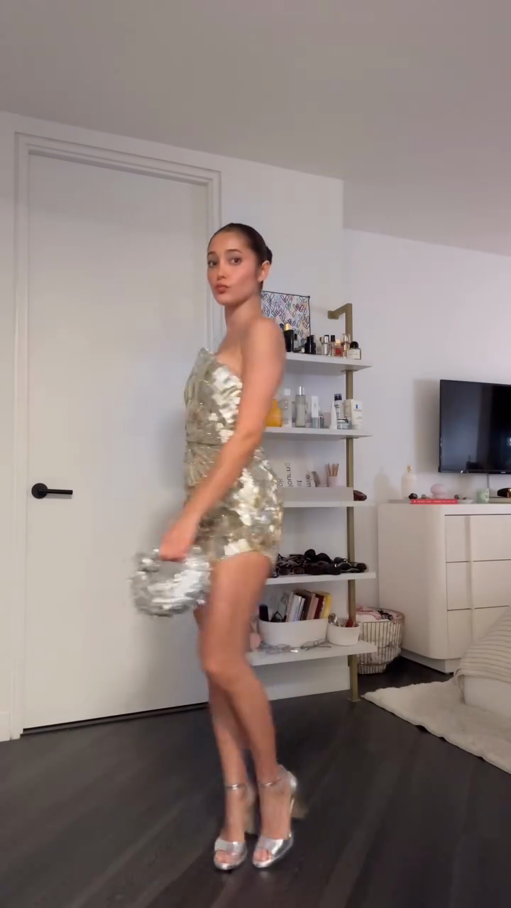 This stunning gold sequined off-the-shoulder mini dress is embellished with shimmering gold sequins arranged in an intricate pattern that catches the light from every angle, creating a dazzling effect. The off-the-shoulder design showcases the curves of the shoulders and neckline, adding an elegant touch. Paired with silver high-heeled sandals and a sparkling clutch, this dress is perfect for a formal event, a party, or any occasion where you crave a glamorous look.
