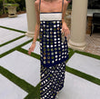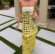 The dress is long and has huge sequins sewn in, another fun detail. Make a statement with our playful and eye-catching mirrored dress. Decorated with hand-stitched sequins, this dress is designed to turn heads at any party or special occasion. Available in pink, black, burgundy, navy blue, and orange.