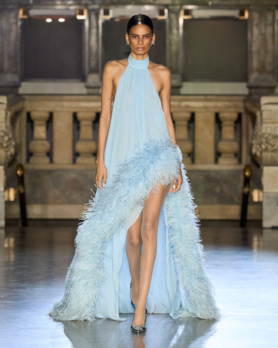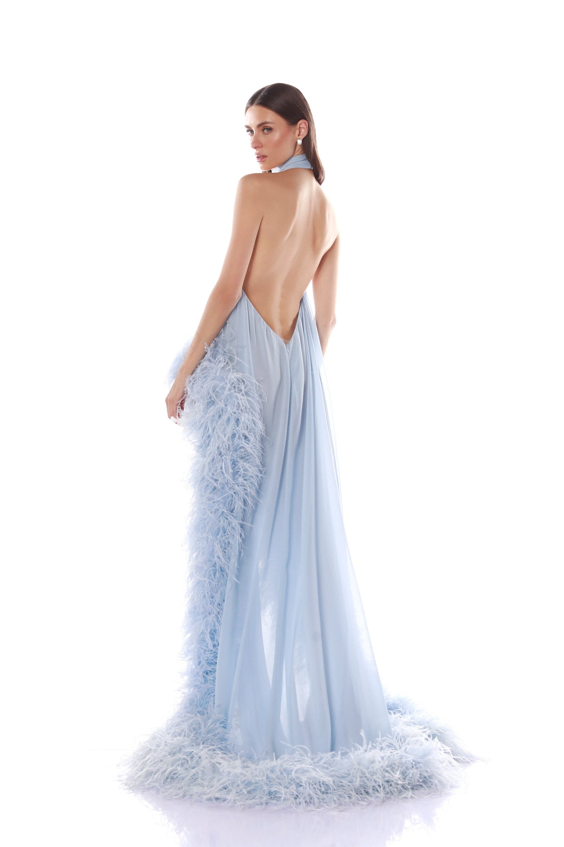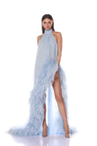 This stunning light blue halter-back gown features a high neckline that elegantly frames the shoulders and neck. The bodice is crafted from a flowing, sheer fabric, creating a delicate, airy feel. Luxurious feathers accent the sides of the skirt, adding a touch of luxury and movement. Highly slit side skirts further elevate the gown's allure, adding a touch of elegance and movement. Paired with embellished heels, this gown is perfect for formal occasions, from evening parties to red carpets. Its unique and captivating design is sure to make you stand out.