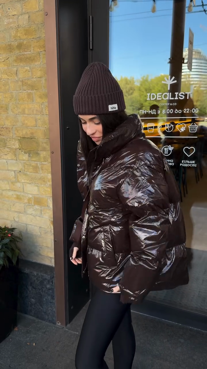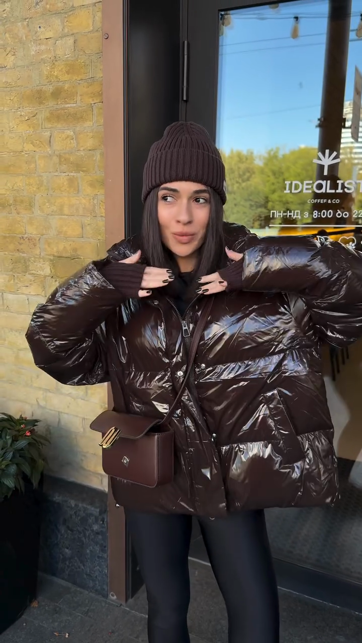 This down jacket features a smooth, lustrous brown fabric for a modern, stylish look. The lustrous fabric makes it stand out and adds a touch of style to your winter wardrobe.