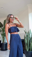 Navy Blue Ruffled Crop Top and Wide - Leg Pants Set