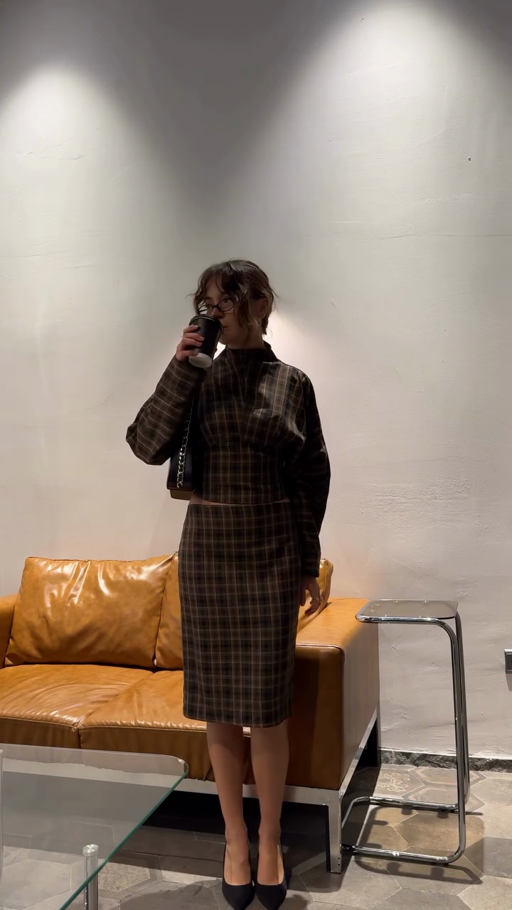 This stylish plaid set consists of a long-sleeved top and a midi skirt, both in a classic plaid pattern. The top features a high neckline and a slightly cropped silhouette, while the skirt has a slim fit for a sleek, streamlined look. Paired with black heels and a compact chain bag, the look is sophisticated and stylish, perfect for any occasion, from work to leisure.