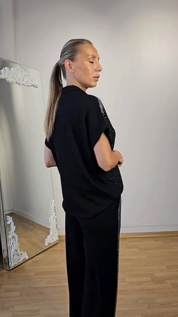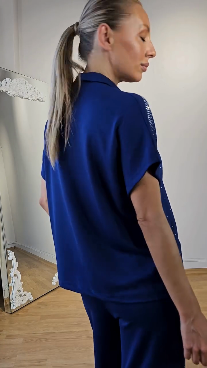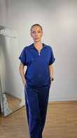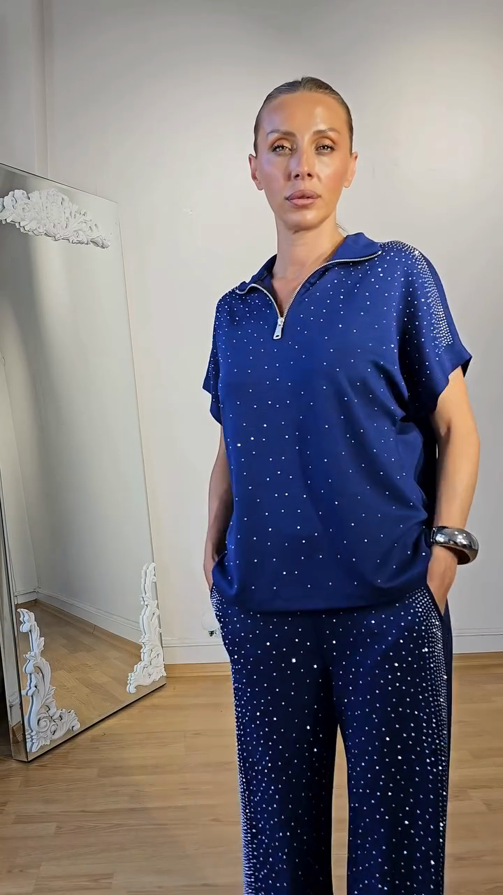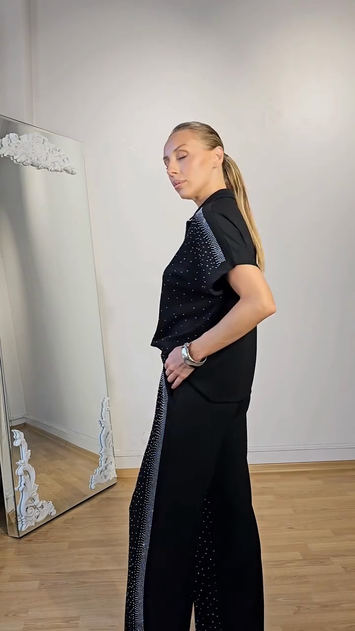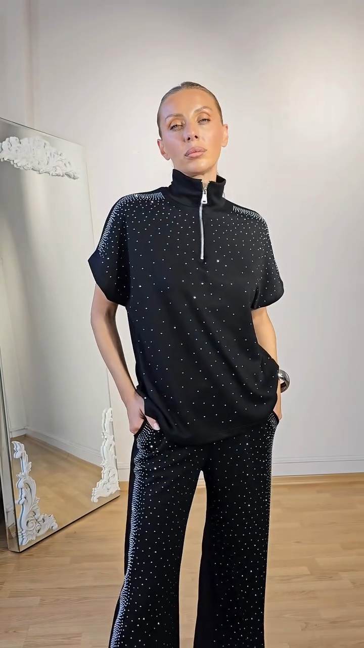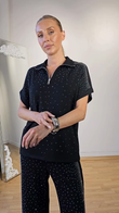 Rhinestone - Embellished Polo Top and Pants Set