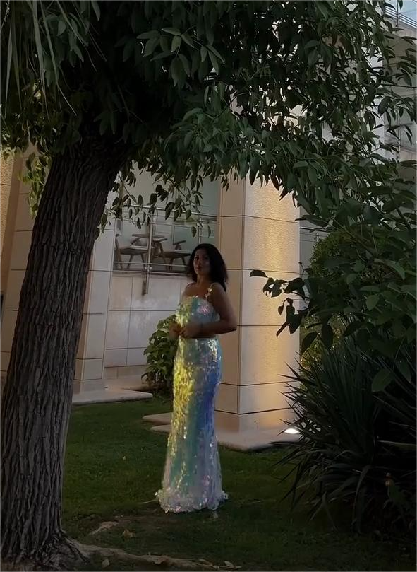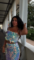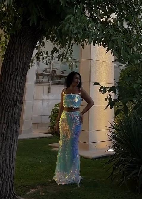 This two-piece set is embellished with dazzling sequins that catch light from every angle, creating a captivating rainbow effect. Pair the cropped top with the maxi skirt for a stylish and glamorous look.