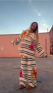 The person is wearing a matching knit co - ord set. The set consists of a beige and black striped sweater with large, colorful floral patterns in pink and yellow, and matching striped pants with the same floral design. They're paired with brown, platform - style shoes. This outfit has a casual, cozy, and stylish vibe, suitable for relaxed outings or loungewear - inspired looks.