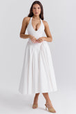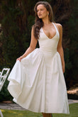 Elevate your elegance with this White Halter Neck Plunge Midi Dress. The halter design, deep V - neckline, and flowing midi skirt create a romantic, timeless look. Perfect for weddings, garden parties, or special events. Lightweight fabric ensures fast page load. Shop now for a show - stopping, feminine outfit!